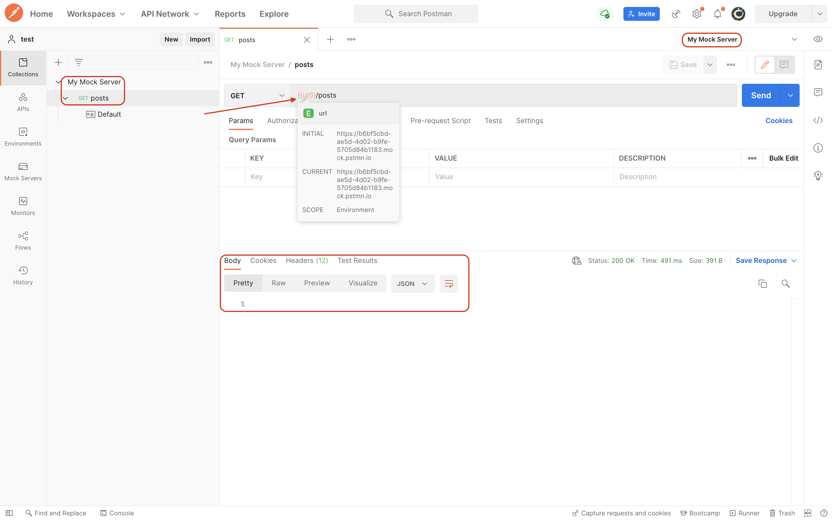 1. 到 Collections Tab 找到剛剛初始化的 Request, {{url}}會帶入環境變數所以右上角請選擇剛剛建立的 mock server name,按下 Send 後會發現下面的 Response 一片空白,這是因為我們還沒設定 Mock Server Response。