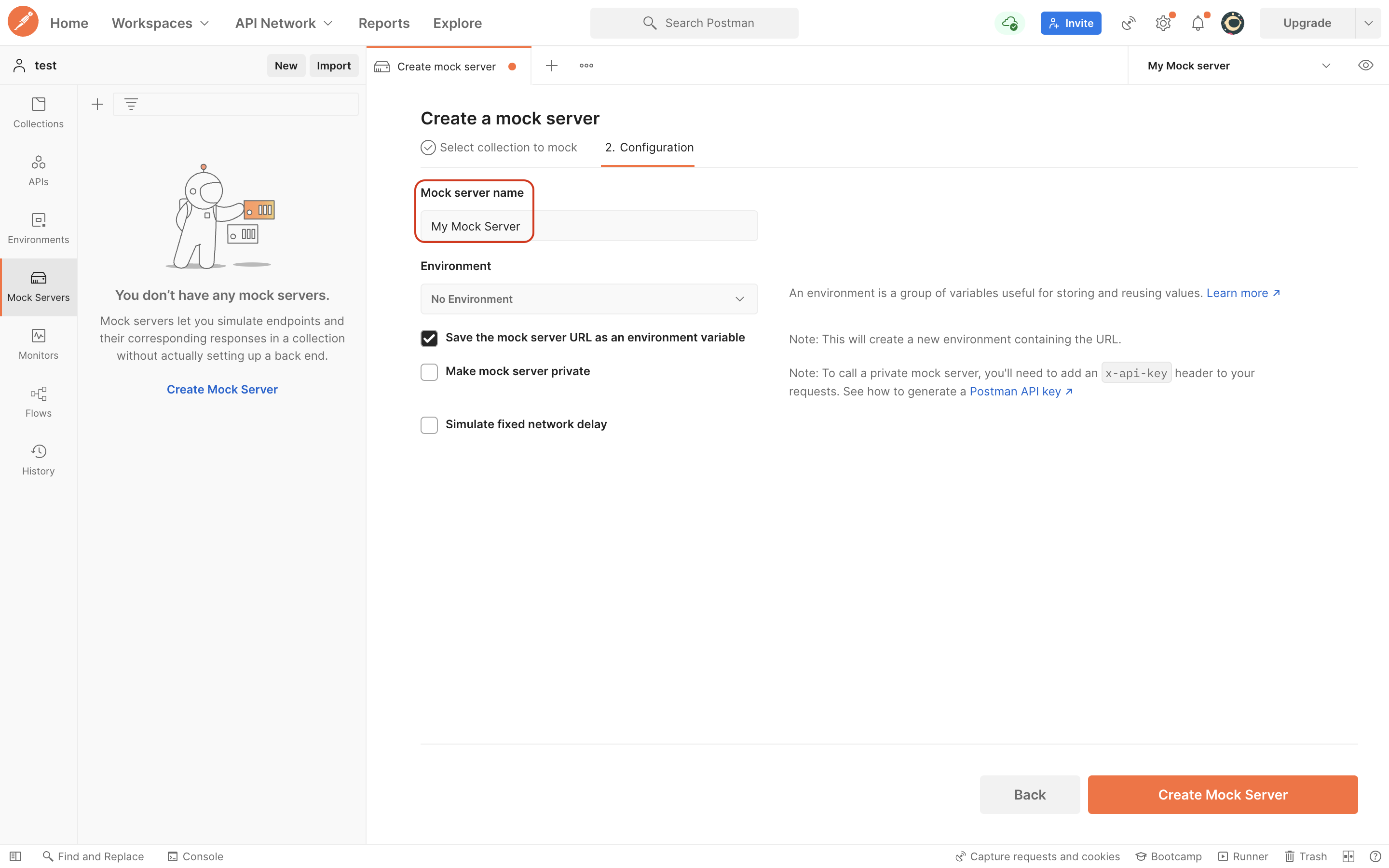 2. 幫 Mock Server 取個名字,並建議你勾選儲存 mock server URL 到環境變數的選項。